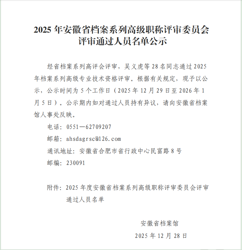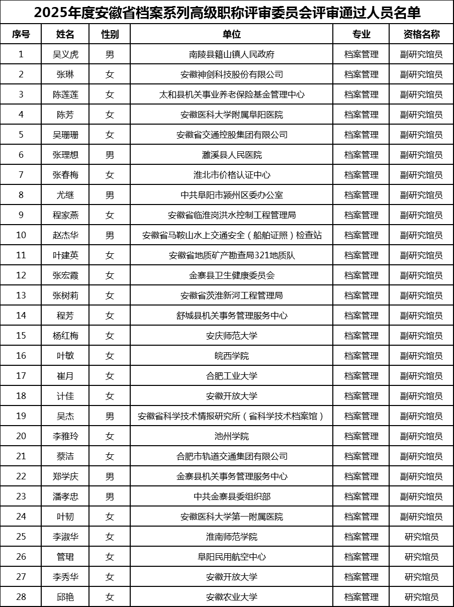2025年安徽省档案系列高级职称评审委员会评审通过人员名单公示